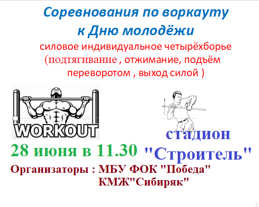 24 июня на спортплощадке за ГДК прошли соревнования по воркауту (индивидуальное силовое многоборье) и выполнению нормативов ГТО (подтягиванию на высокой перекладине, сгибанию и разгибанию рук в упоре лёжа, подъёму туловища из положения лёжа ). Они были организованы МБУ ДО «Спортивная школа Рыбинского района» и КМЖ "Сибиряк".