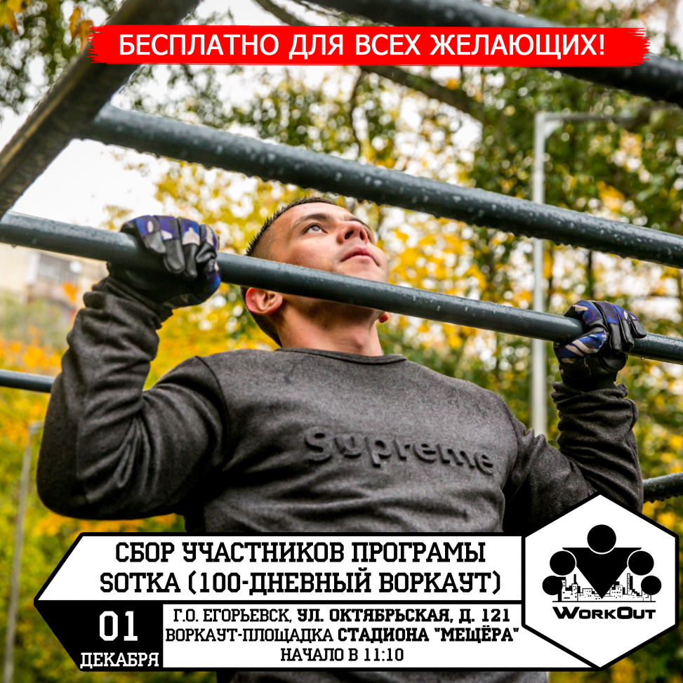 <url="https://100.workout.su/">SOTKA (100-дневный воркаут)</url> (присоединиться можно любому желающему, в любое время, вне зависимости от пола и независимо от уровня подготовки